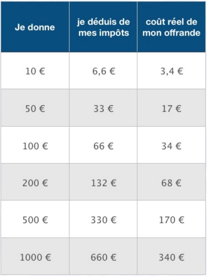 En vertu de la loi sur les associations cultuelles loi 1905, tous les dons que vous faites sont déductibles à 66% de votre impôt sur le revenu dans la limite de 20% de vos revenus imposables.